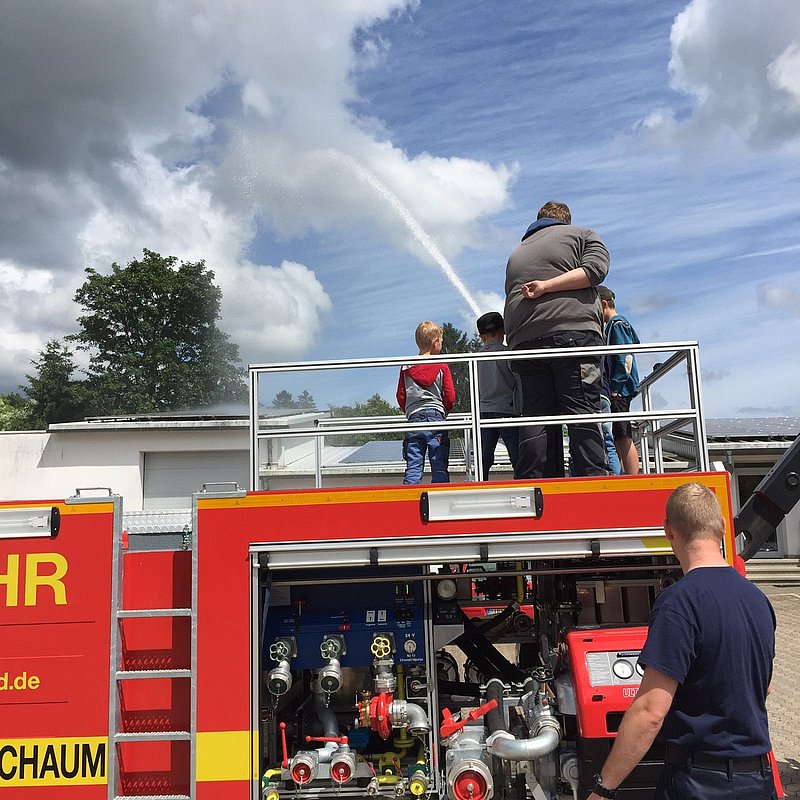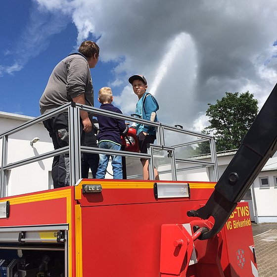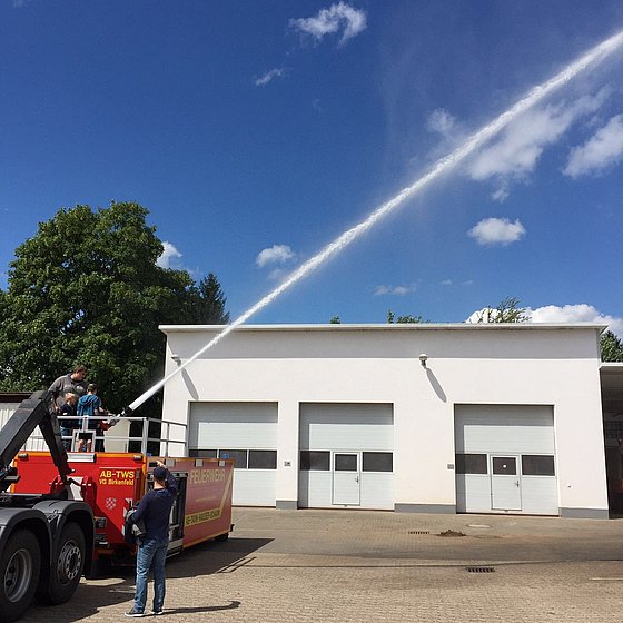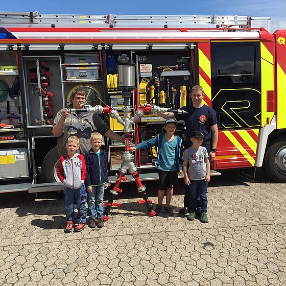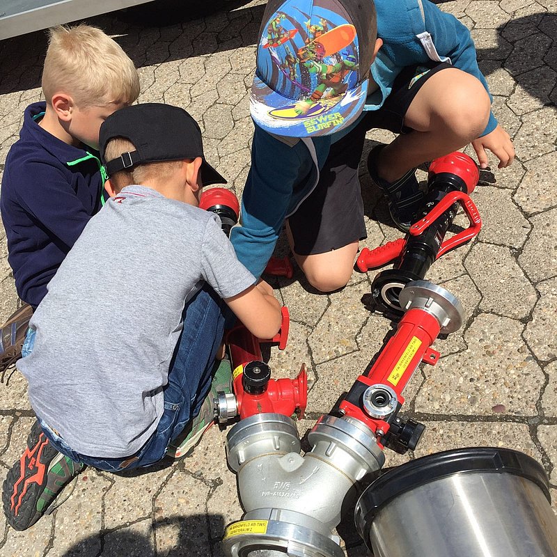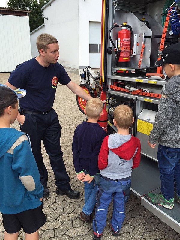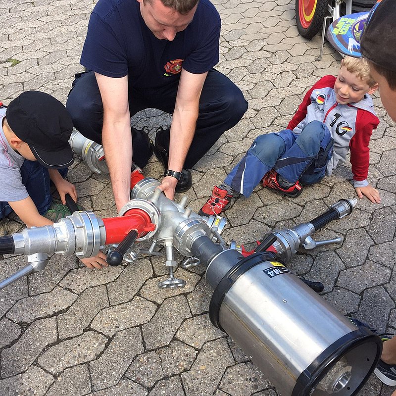 Da das Wetter leider nicht mitspielte, musstem die Bambini auf die beliebte Wasserschlacht verzichten. Stattdessen bastelten die Kids mit feuerwehrtechnischen Geräten einen Roboter, im Anschluss daran durften sie dann mit dem Monitor des AB-TWS doch noch mit Wasser spritzen!