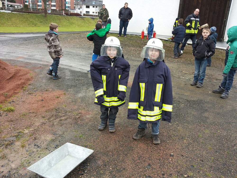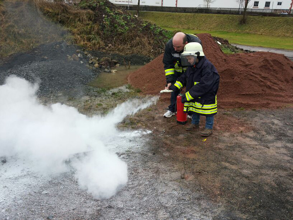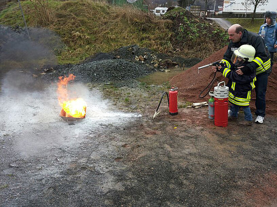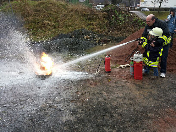 Unsere Bambinis machen Löschübungen mit verschiedenen Feuerlöschern